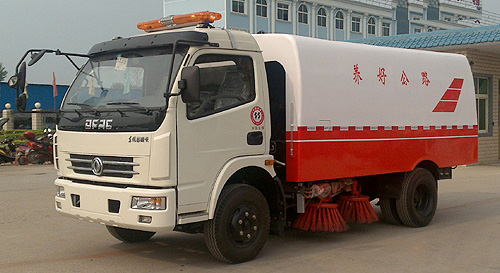 清扫:副发动机驱动液压油泵和风机工作。液压油泵驱动左、右扫盘伸缩、升降、旋转。左右扫盘将两侧的垃圾扫至洗扫车下,吸嘴前方。风机使垃圾箱、吸管和吸嘴组成的风道产生高速气流,在气流的作用下,垃圾吸入吸嘴,并进入垃圾箱中。底盘发动机驱动洗扫车向前行走,扫至吸嘴前方的垃圾不断进入到吸嘴中,并源源不断地被吸到垃圾箱中,实现路面清扫。