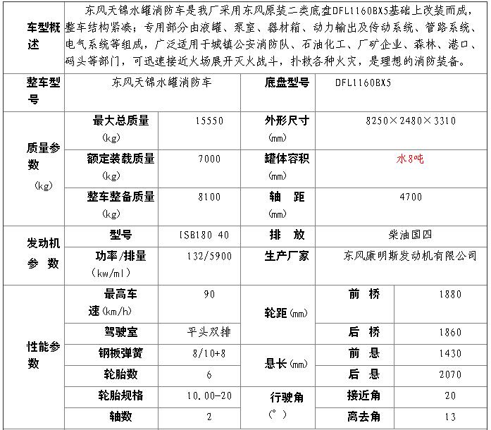 东风天锦水罐消防车主要技术性能参数(8T)